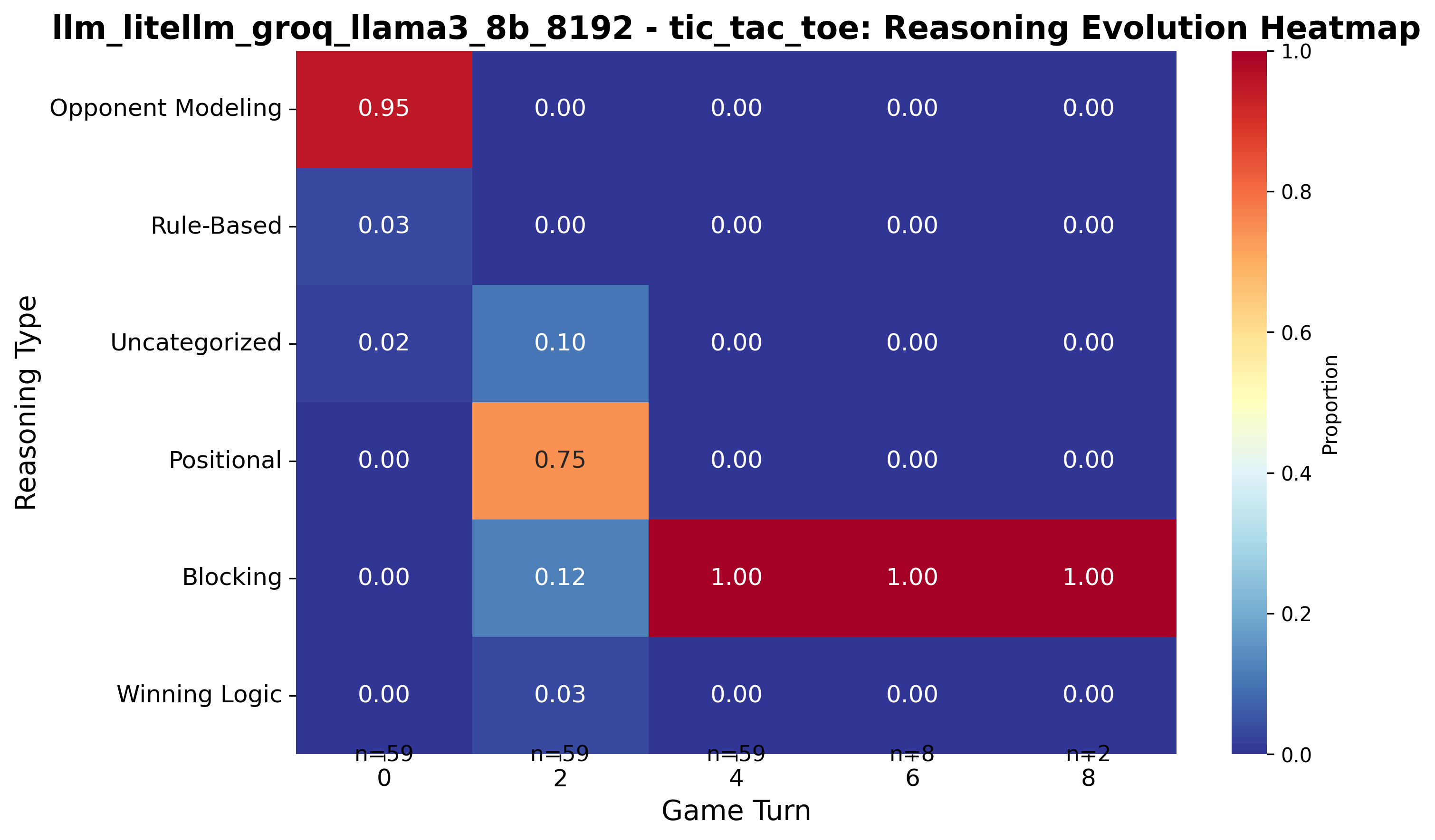 Llama3 8B starts with opponent modeling, shifts to positional play, then locks into blocking for the rest of the match. This suggests a defensive bias once the mid-game begins, perhaps prioritizing risk avoidance over creating winning opportunities.