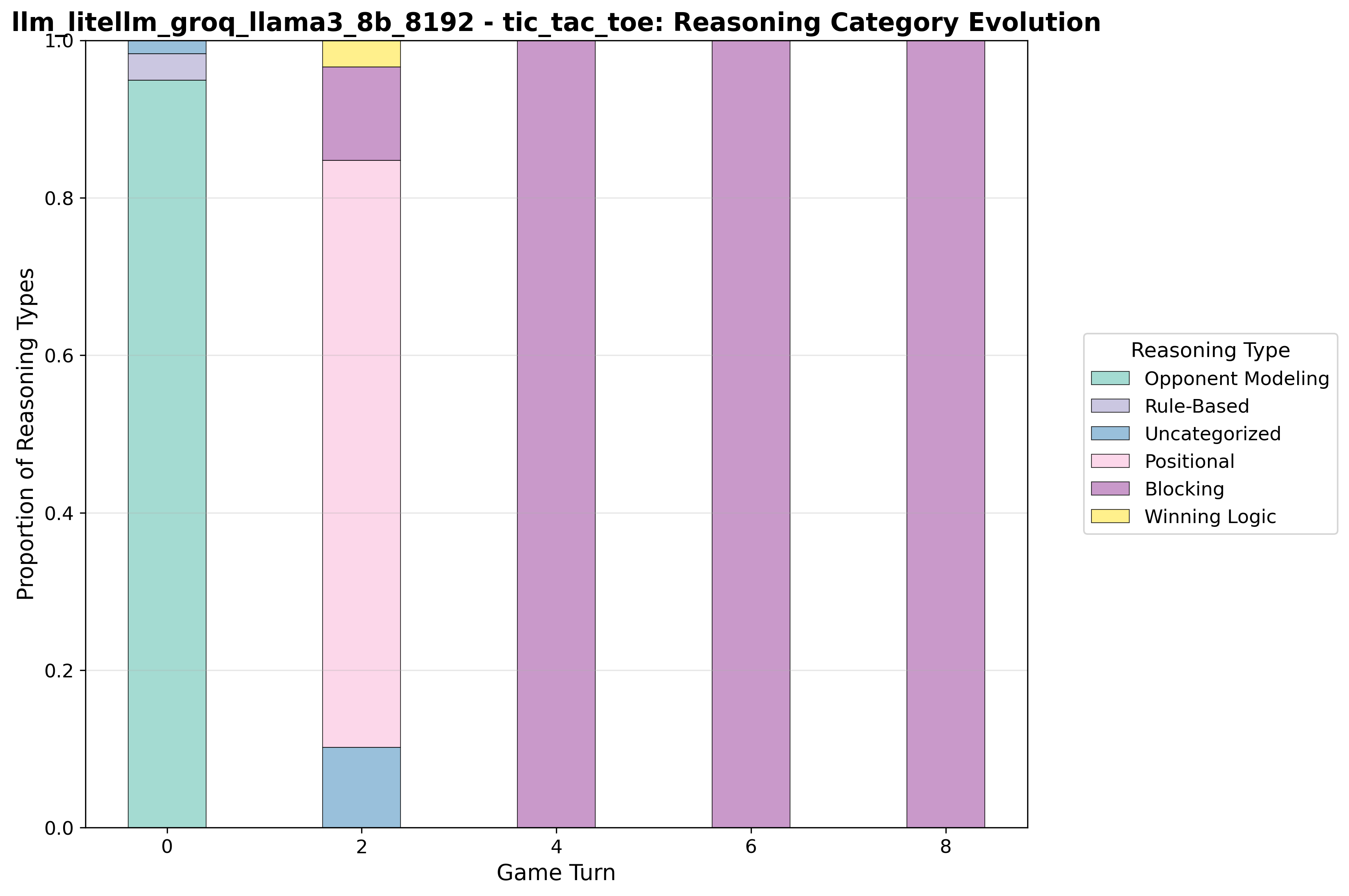Proportion of reasoning categories as the game progresses. How Llama3 8B's reasoning patterns evolve during tic-tac-toe gameplay.