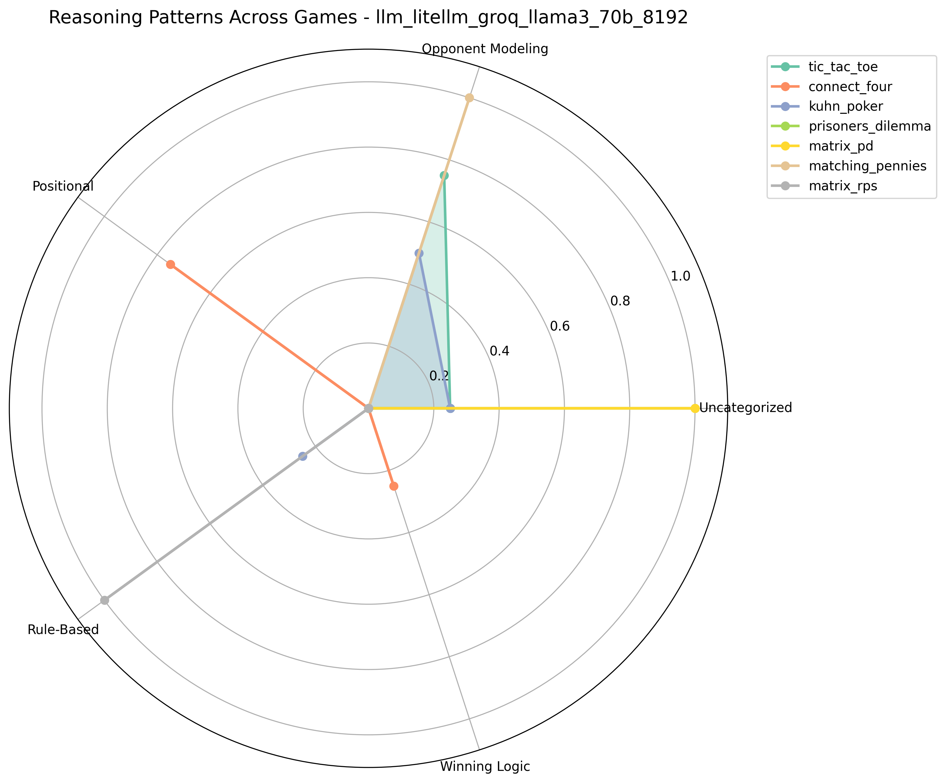 The radar chart reveals that Llama3 70B distributes its reasoning differently depending on the game context. For example, in Matching Pennies and Matrix PD, opponent modeling dominates, while Connect Four favors positional play. Rule-based reasoning emerges in Matrix RPS, showing that the model switches to more deterministic strategies when the game structure rewards fixed patterns.