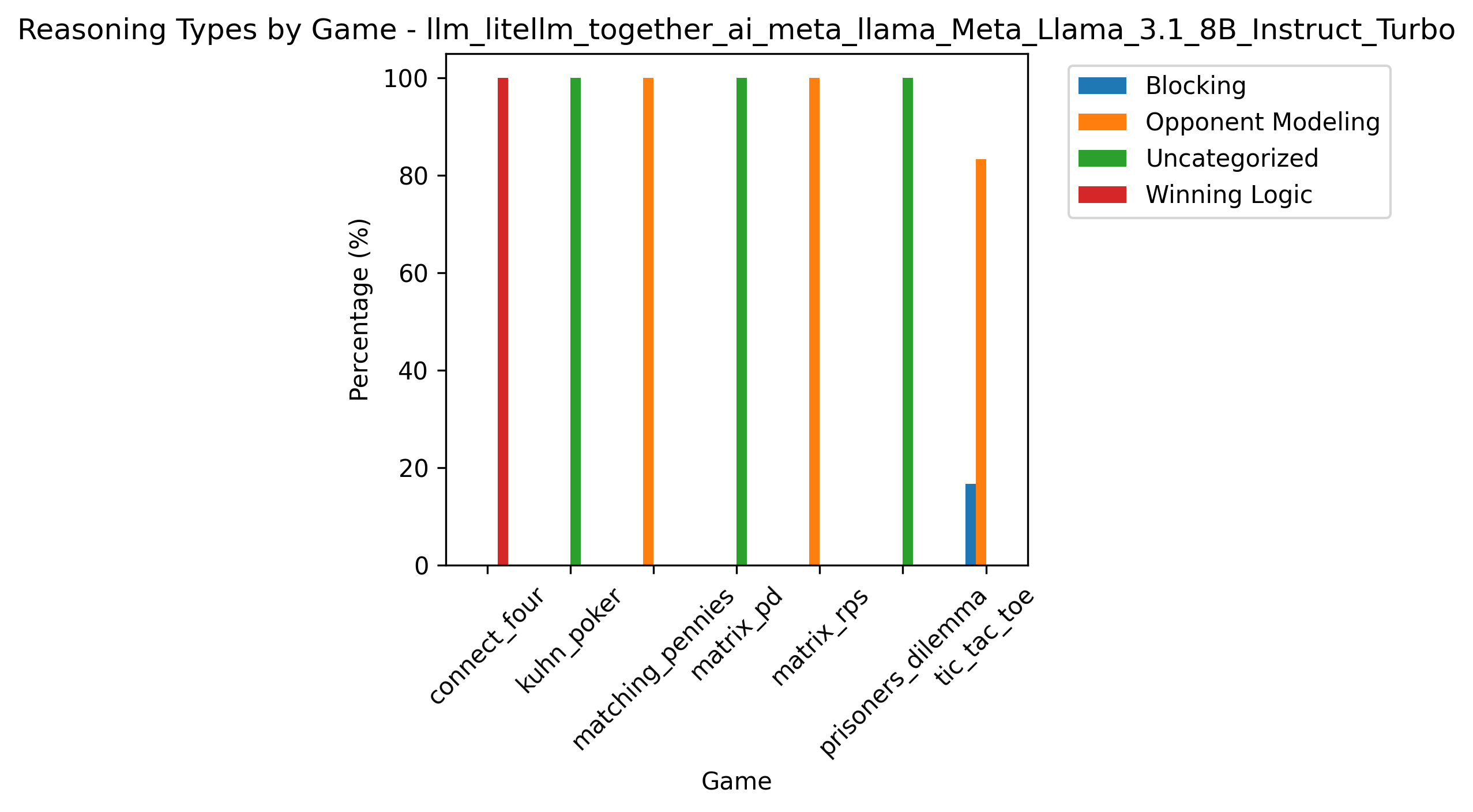While Llama3 70B displays adaptive patterns across games, Llama3.1 8B Instruct often commits to a single reasoning mode for an entire match (e.g., Winning Logic in Connect Four, Opponent Modeling elsewhere).